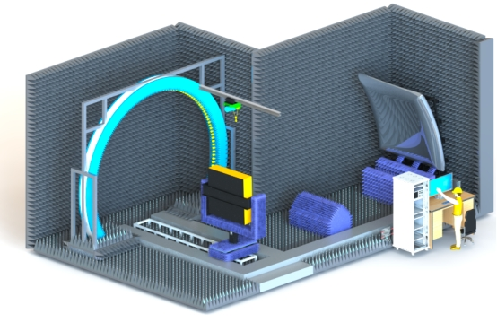 The microwave anechoic chamber used for indoor testing is a spatial structure, which can be a building or a box. As shown in Figure 1, the microwave anechoic chamber is a shielding space that isolates external electromagnetic waves. The absorbing materials in the anechoic chamber can effectively absorb internal electromagnetic waves in the measured frequency range, simulating a pure infinite electromagnetic space without electromagnetic interference.